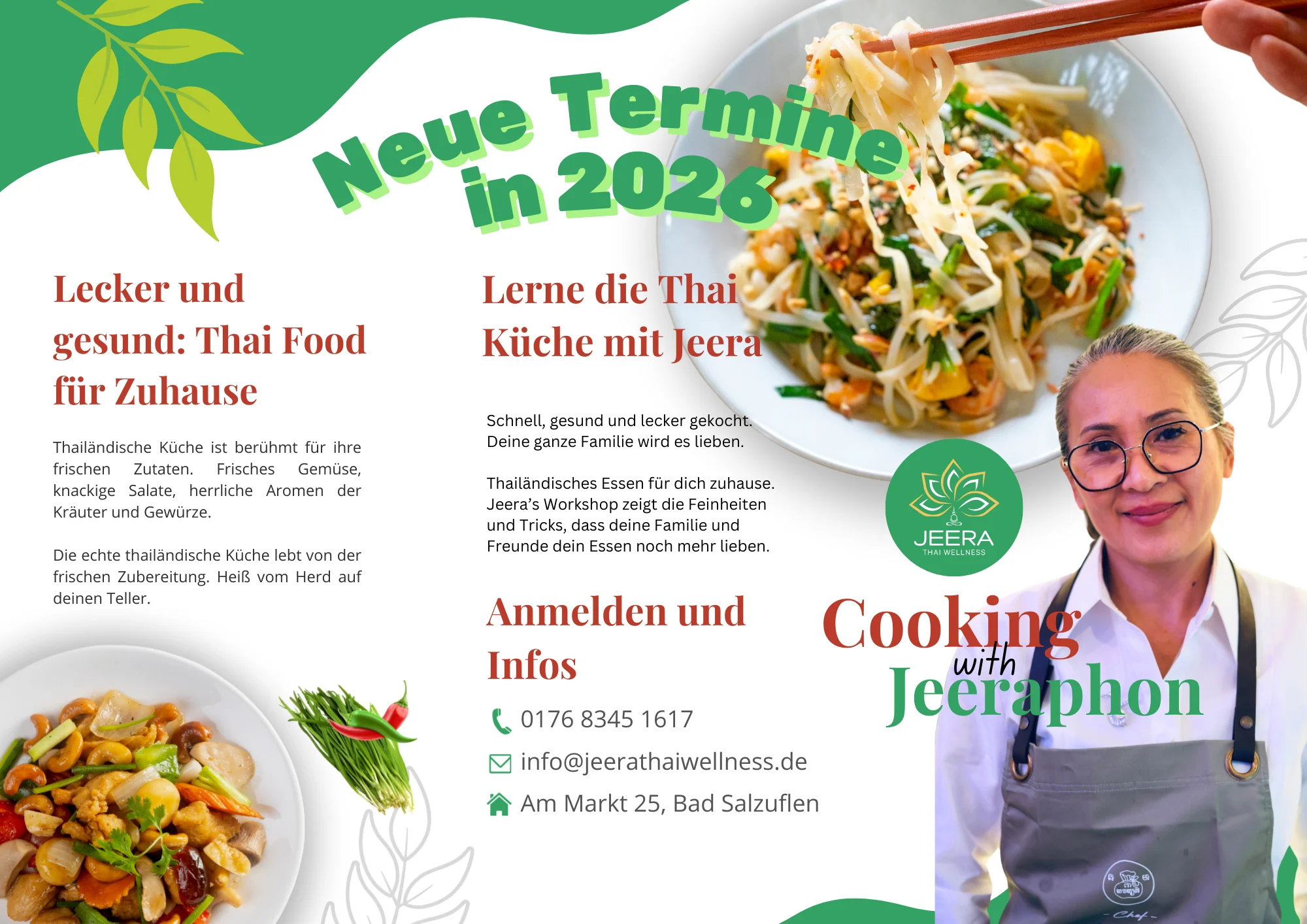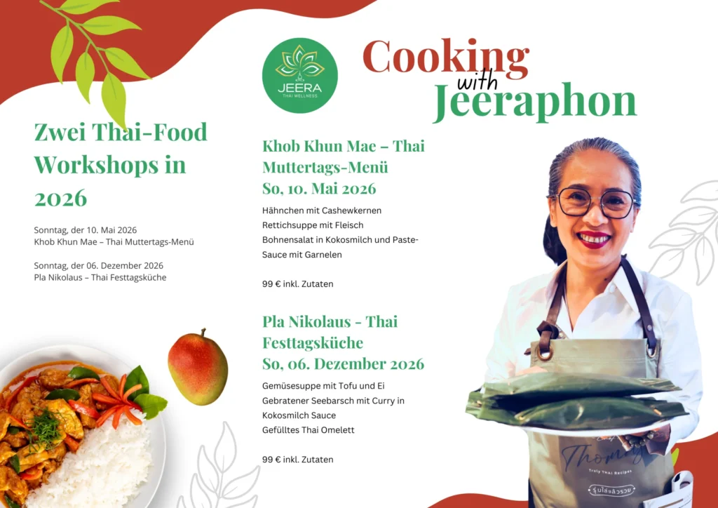 Entdecke die Aromen Thailands auf die beste Weise: selbst kochen. Lerne von Jeeraphon die Geheimnisse und Kniffe der echten Thai Küche – gesunde Gerichte, flott zubereitet, die bei dir zuhause garantiert ankommen.